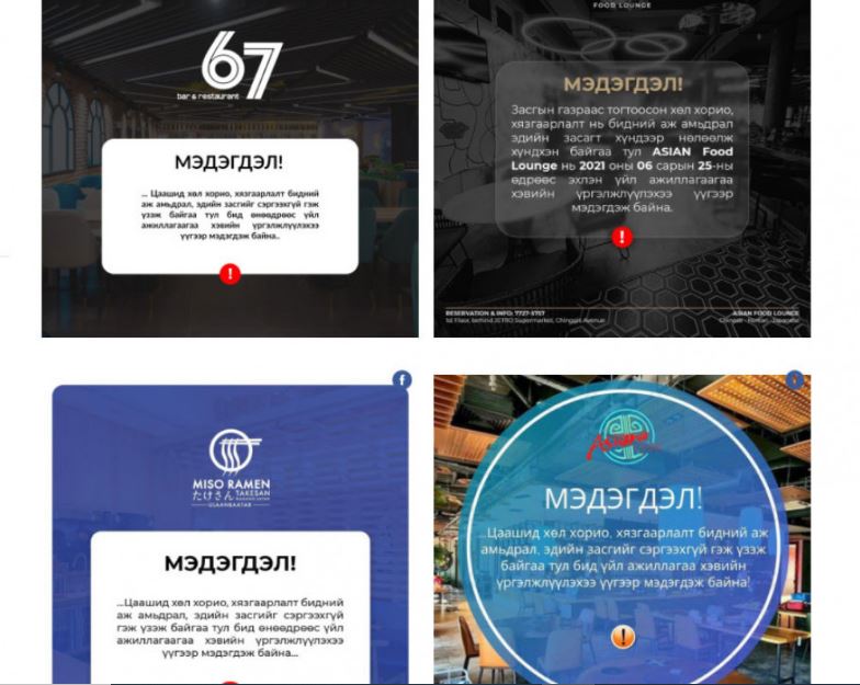 Түүнчлэн “World Gym” фитнессийн төв “Бид халамж мөнгө, тусламж, зээл хүсээгүй. Зүгээр л ажлаа хиймээр байна.” хэмээн мөн ижил мэдэгдэл гаргасан бол “Vinyl Lounge” “Бид түрээсийн асуудал, зээлийн дарамт, бараа материалын өр, хомсдол, торгууль, шийтгэл, тогтвортой ажиллахгүй байгаа явдал, алдагдлууд гээд тоо томшгүй олон хүндрэлийг даасаар явсан. Цаашид үнэхээр тэвчиж чадахгүй нь” гэжээ.