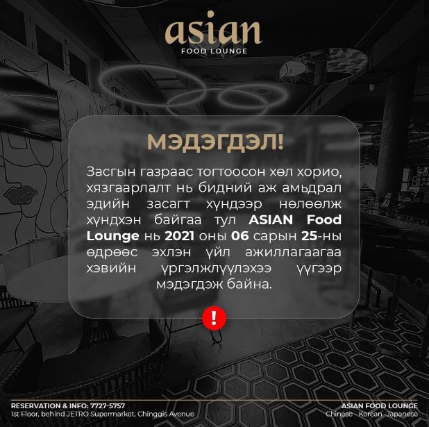 Тухайлбал, “Такесан Мисо Рамен” ресторан “Төр засгийнхаа koвидтой тэмцэх бодлогыг хүндэтгэн өнөөдрийг хүртэл хорио цээр, эрүүл ахуй халдвар хамгааллын дэглэмийг чандлан баримталлаа. Заалны үйлчилгээ явуулахгүй бол манайх орлогогүйтэй адил байдаг. Тиймээс заалаар үйлчлэхгүй гэсэн хязгаарлалтын үед үйл ажиллагаагаа зогсоож нилээд олон сар ажилласангүй.