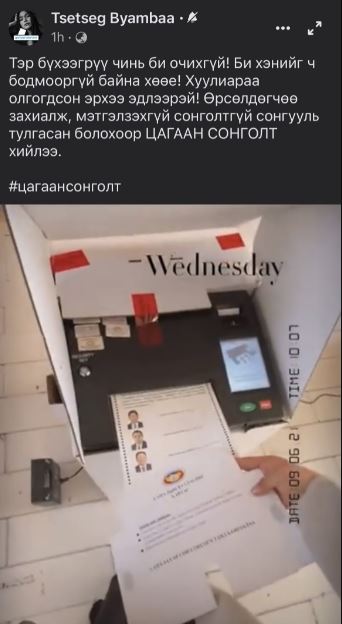 Тэгвэл сонгуулийн өдөр иргэн Б.Цэцэг Сонгинохайрхан дүүргийн хэсгийн хороонд очиж санал өгөхдөө, бүх үйл явцаа дүрсжүүлж аваад фэйсбүүктээ тавьсан юм.