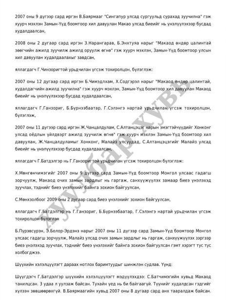 -2007 оны 12-р сард Г.Чинзоригтой бүлэглэн Ч, С нарыг “Макао улсад өндөр цалинтай худалдагчийн ажилд зуучилна” хэмээн хуурч, хил давуулаад би еийг нь ү нэлүүлэх зорилгоор бусдад худалдсан