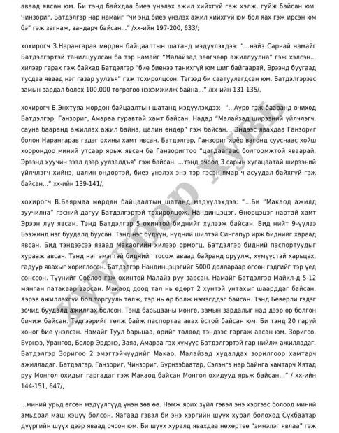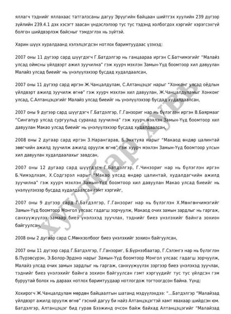 -2007 оны 11-р сард иргэн Б-г “Малайз улсад оймсны үйлдвэрт ажилд зуучилна” хэмээн хуурч мэхэлж, хил давуулан Малайз улсад биеийг нь үнэлүүлэхээр бусдад худалдсан