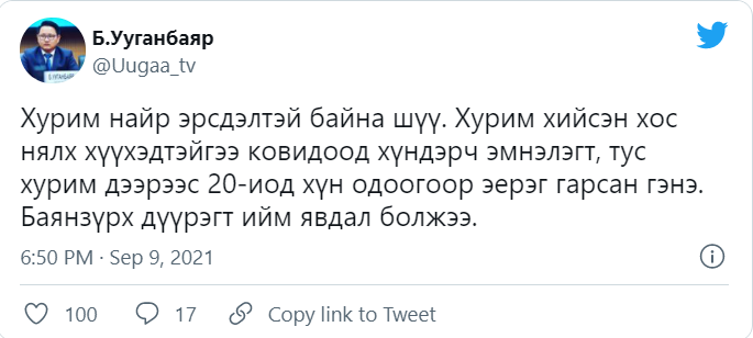 Тэгвэл ЭМЯ-ны хэвлэлийн төлөөлөгч Ц.Ууганабаяр, ‘Хурим найр эрсдэлтэй байна шүү. Хурим хийсэн хос нялх хүүхэдтэйгээ koвидооp хүндэрч эмнэлэгт, тус хурим дээрээс 20-иод хүн одоогоор эерэг гарсан гэнэ. Баянзүрх дүүрэгт ийм явдал болжээ’ гэж мэдэгдлээ.