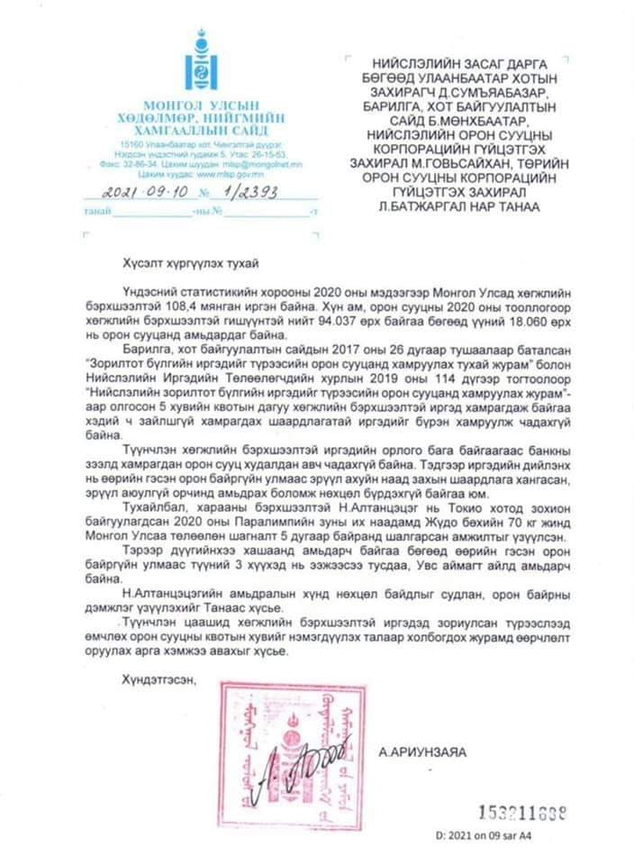 Иймд түүний амьд.ралын хүн.д нөх.цөл байдлыг судлан орон байрны дэмжлэг үзүүлэхийг Хөдөлмөр, нийгмийн хамгааллын сайд А.Ариунзаяа хүсэж, БХБ-ын сайд Б.Мөнхбаатар, НЗД Д.Сумъяабазар нарт албан хүсэлт явуулжээ.
