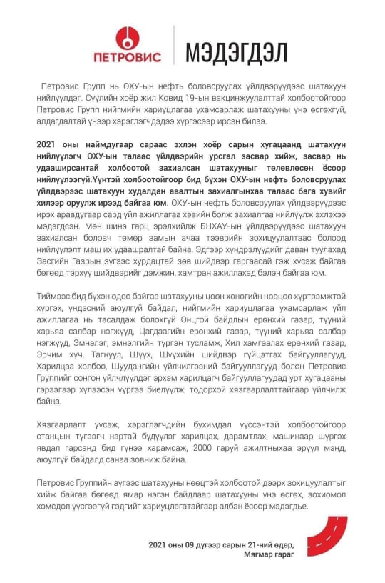 Петровис Групп шатахууны хомсдолтой холбоотой мэдэгдэл гаргалаа.