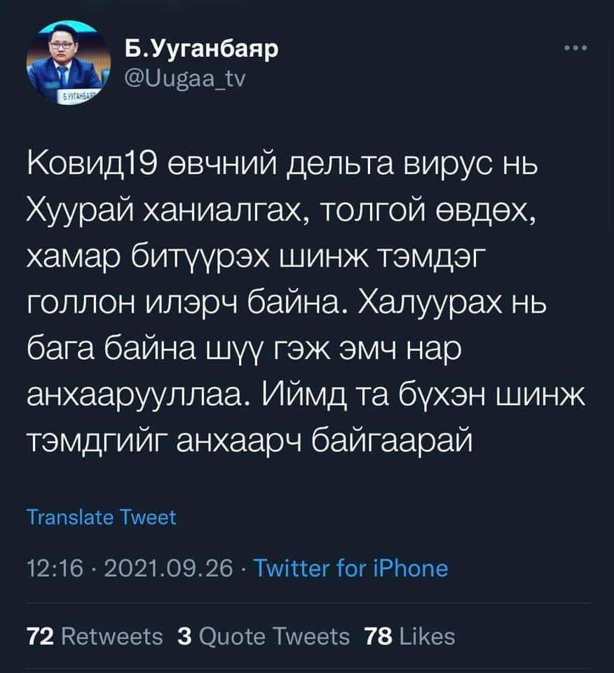 Сүүлийн өдрүүдэд манай улсад коронавирусийн Дельта хувилбарын тархалт нэмэгдэж байгаа талаар эмч, мэргэжилтнүүд анxaaруулж буй. Тэгвэл ЭМЯ-ны хэвлэлийн төлөөлөгч Б.Ууганбаяр Дельта вирусийн үед ямар шинж тэмдгүүд зонхилон илэрч буй талаар өөрийн твиттер хуудастаа бичжээ.