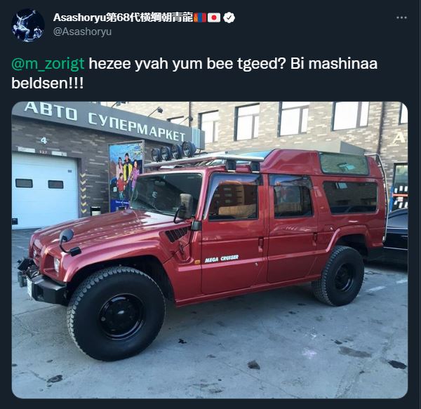 Тэрбээр ”Нэг иймэрхүү машинтай боллоо. Над шиг хөдөө гадаа их явдаг хүнд хэрэгтэй унаа мэт. Онгирч гайхуулж байгаа зүйл огт биш шүү. Сайн тэрэгтэй явахгүй бол Монгол шиг өргөн уудам нутагт хэцүүднэ” гэж сонирхуулсан байсан. ЭНэ машиныг эд мэддэг улс үнэ нь лавтайяа нэг тэрбум төгрөг хүрнэ гэж үнэлжээ.