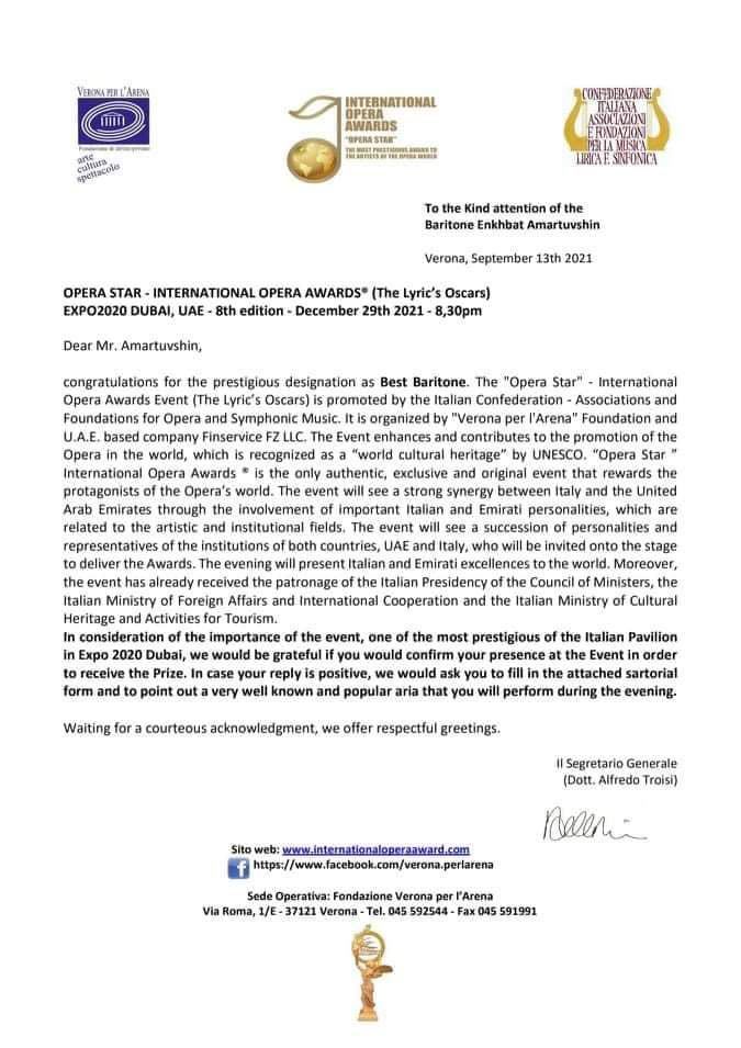 Venora l’Arena сан болон Арабын нэгдсэн Эмират улсад төвтэй Finservice FZ компани хамтран зохион байгуулж дуурийн шилдгүүдийг тодруулах “Opera Star” наадмаас Монгол Улсын гавьяат жүжигчин Э.Амартүвшин дэлхийн шилдэг баритон хоолойтой дуучнаар шалгарсан байна.