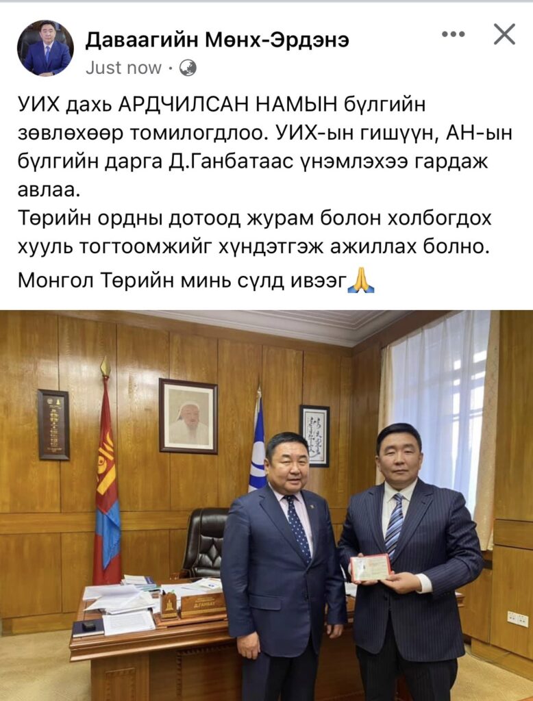 Энэ удаа түүний УИХ дахь АН бүлэгт урьсан гэх мэдээлэл байгаа бөгөөд тэр өөрийн цахим хуудастаа “УИХ-ын гишүүн, АН-ын бүлгийн дарга Д.Ганбатаас үнэмлэхээ гардаж авлаа. Төрийн ордны дотоод журам болон холбогдох хууль тогтоомжийг хүндэтгэж ажиллах болно” гэж бичжээ