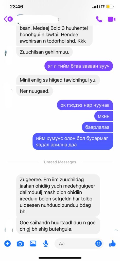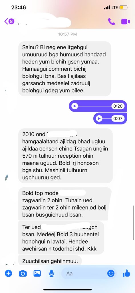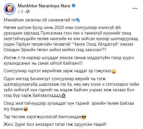 Тэрээр өөрийн цахим хуудастаа “Нөгөө шүтээн Болд чинь 2020 оны сонгуулиар ичихгуй фб уралдаан зарлаад Пунсалмаа гээч хэн ч танихгүй хүүхнийг охид эмэгтэйчүүдийн төлөө хамгийн их юм хийсэн хүнээр шалгаруулаад хэдэн тэрбум төгрөгийн төсөвтэй “Чанга Охид уйлдаггуй” хэмээх Охидын эрхийн төсөл хийнэ мийнэ гээд хаачсан?!? Ингэж л та нараар шоуддаг юмсаа таньж мэддэггүйм гэхэд хуур.ч хуль.хид.саныг нь санах ойтой байгаая!!!! Сонгуулиар хүртэл өөрийгөө зарж чаддаг эр гэжугааз. Одоо ингээд бичингуут сонгуулиар өөрийг нь тэгж шалгаруулаагуйд шарлахаж гэх бх неү неү хэзээ ч сэтгэлээрээ тийм зүйл хийхгүй хүн гэдгийг нь мэдэж байсан учраас яаж халаах бол гээд бүр харж байлааллдддд. Охид эмэгтэйчүүдээр зу.гаац.даг хүн тэдний эрхийн төлөө байлаа юу бадма. Тэр төслөө хэрэгжүүлээй бантсандаа.” гэжээ