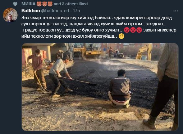 Ерөнхийдөө Манайхны зам барьж байгаа царай энэлдээ юмыг монголчилно гэж арай дэндүүлэх юм гэснээс иймэрхүү маягаар барьсан зам нь жил ч бололгүй нил нүх сүв, эвдрэл гэмтэл улмаар дахиад л тендер дахиад л төсвийн мөнгө.