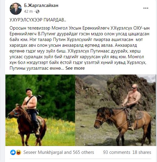 Түүнчлэн Путины Тувад амарч байх үедээ авхуулсан морь унаж буй зургийг ч мөн дуурайсан бөгөөд У.Хүрэлсүх өмнө нь зургийн позоо бодчихсон байсан нь тодорхой байна гэжээ.
