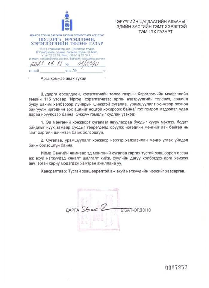 ШӨХТГ: ТЕЛЕВИЗ, ЦАХИМААР ЯВАГДАЖ БУЙ СУГАЛАА НЬ МӨН.ГӨ УГ.ААЖ БУЙ ҮЙЛДЭЛ БАЙЖ БОЛЗОШГҮЙ ХЭМЭЭН ЭЦГ-Т ХАНДСАН