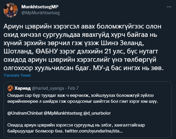 УИХ-ын гишүүн Ц.Мөнхцэцэг охидод ариун цэврийн хэрэгслийг үнэгүй олгохоор хуульчлах хэрэгтэй талаар твиттер хуудсандаа жиргэсэн байна.