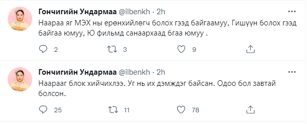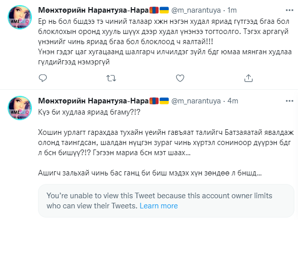 Тэгвэл жүжигчин бүсгүй өнөөдөр цахим орчинд Дуучин Наратай муудалцав. Тэрээр “Наарааг блок хийчихлээ. Уг нь их дэмждэг байсан. Одоо бол завтай болсон.Наараа яг МЭХ ны ерөнхийлөгч болох гээд байгаамуу, Гишүүн болох гээд байгаа юмуу, Ю фильмд санаархаад бгаа юмуу ” хэмээн ихэд ууртай жиргээ хийлээ.