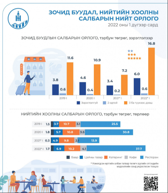 Нийтийн хоолны салбарын орлого 2022 оны нэгдүгээр сард 60.6 тэрбум төгрөг болж, өмнөх оны мөн үеэс 29.6 тэрбум төгрөг буюу 95.5 хувиар өсжээ. Үүнд рестораны орлого өмнөх оны мөн үеэс 23.8 (2.7 дахин) тэрбум төгрөгөөр өссөн нь голлон нөлөөлсөн байна.