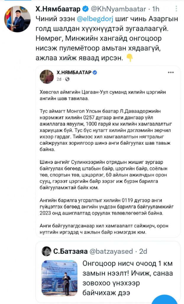 ХХЗДХ-ийн сайд Х.Нямбаатарын Хөвсгөл аймагт онгоцоор очиж 1км замын нээлтэд оролцож буй үйл явц олон нийтийн сүлжээнд шүүмжлэл дагуулаад буй. Тэгвэл тэрбээр нэгэн жиргээчийн шүүмжлэлд “Чиний эзэн Элбэгдорж шиг чинь Азаргын голд шалдан xvvxнvvдтэй зyгaaцаагүй. Нөмрөг, Минжин хангайд онгоцоор нисэж пулемётаар амьтан хадаагүй, ажлаа хийж яваад ирсэн” хэмээн бичжээ.