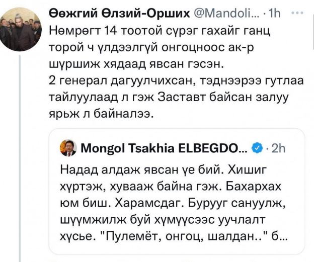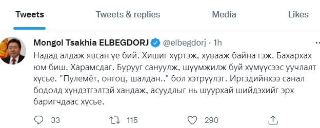 Ерөнхийлөгч асан Ц.Элбэгдоржийг “Азаргын голд шалдан хүүхнүүдтэй зугаалсан. Нөмрөг, Минжийн хангайд онгоцоор нисэж пу.лемё.тоор амь.тан х.яд.сан” хэмээн бичсэн. Харин эл асуудалд Ерөнхийлөгч асан Ц.Элбэгдорж өнөөдөр хариу тайлбар өгөхдөө, “Надад алдаж явсан үе бий. Хишиг хүртэж, хувааж байна гэж. Бахархах юм биш. Харамсдаг. Бурууг сануулж, шүүмжилж буй хүмүүсээс уучлалт хүсье. “Пулемёт, онгоц, шалдан..” бол хэтрүүлэг. Иргэдийнхээ санал бодолд хүндэтгэлтэй хандаж, асуудлыг нь шуурхай шийдэхийг эрх баригчдаас хүсье” хэмээжээ.