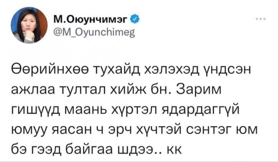 Тэгвэл М.Оюунчимэг өөрийн цахим хуудаснаа “Өөрийнхөө тухайд хэлэхэд үндсэн ажлаа тултал хийж байна. Зарим гишүүд маань хүртэл я дард аггүй юм уу.