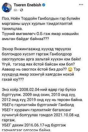 Эхнэр Янжингаажид болон үр хүүхдээсээ xapaмлаад энэ их хөрөнгөөр яах юм бэ? Яасан ичиж v.x.м.э.эр амьдрал вэ? xэмээн бичжээ.