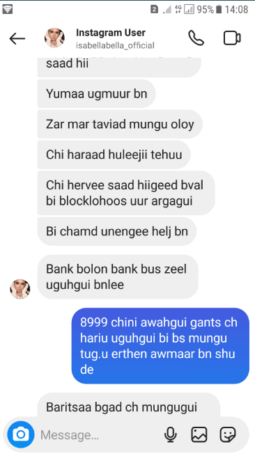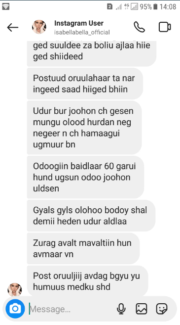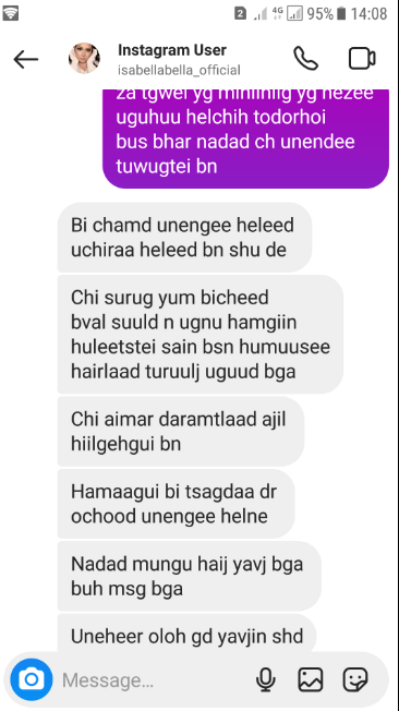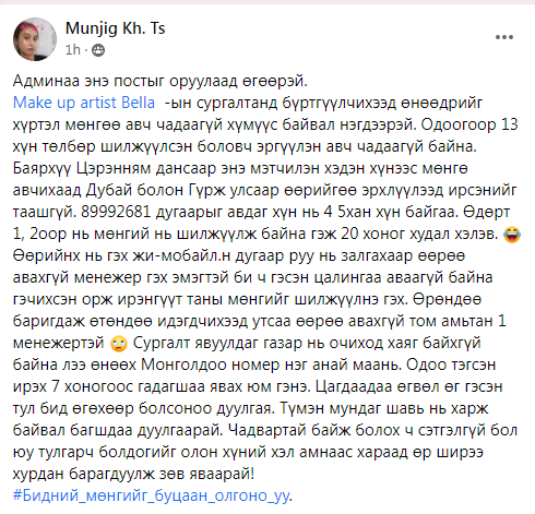 Монголд ирсэн, би цөөхөн хүнд орохгүй гэх мэтээр хэлжээ. Харилцаанаас харилцаа үүсдэг гэдгийг нүүр будагч Bellа мэддэггүй бололтой. Өөрийнхөө мэдлэг ур чадвараараа олны таашаалд нийцсэн түүнд олны эрүүл мэнд, тав тухтай суралцах орчин бүрдүүлэх нь хамаагүй бололтой.
