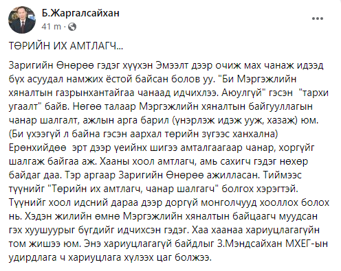 Тэр аргаар Заригийн Өнөрөө ажилласан. Тиймээс түүнийг “Төрийн их амтлагч, чанар шалгагч” болгох хэрэгтэй. Түүнийг хоол идсний дараа дээр доргүй монголчууд хооллох болох нь. Хэдэн жилийн өмнө Мэргэжлийн хяналтын байцаагч муудсан гэх хуушуурыг бүгдийг идчихсэн гэдэг. Хаа хаанаа хариуцлагагүйн том жишээ юм. Энэ хариуцлагагүй байдлыг З.Мэндсайхан МХЕГ-ын удирдлага ч хариуцлага хүлээх цаг болжээ.