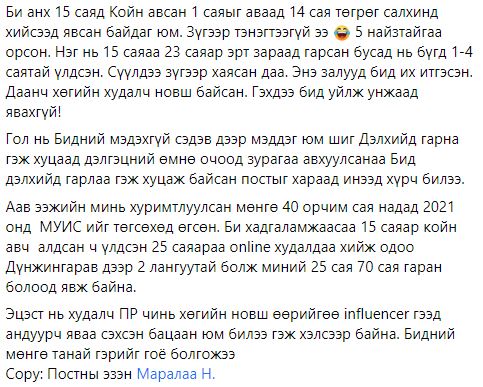 Эцэст нь худалч ПР чинь хөгийн новш өөрийгөө influencer гээд андуурч яваа сэхсэн бацаан юм билээ гэж хэлсээр байна. Бидний мөнгө танай гэрийг гоё болгожээ…” гэв.