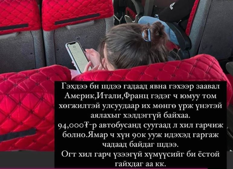 94,000 төгрөгөөр автобусанд суугаад л хил гарчихаж болно. Ямар ч хүн 90к ууж идэхэд гаргаж чадаад байдаг ш дээ. Огт хил гарч үзээгүй хүмүүсийг би ёстой гайхдаг аа. /боломж нь байгаад байхад л пааб баар хэсээд яваад байдгын/” гэв.