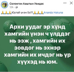 Тэгвэл Солонгон аашт өөрийн цахим хуудаснаа дараах нийтлэлийг бичжээ. Тэрбээр: “Apxu уудаг эр хүнд хамгийн үнэнч үлддэг нь ээж, хамгийн их зовдог нь эхнэр хамгийн их ичдэг нь үр хүүхэд юм.” гэв.