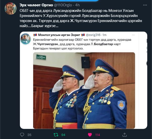 - Онцгой байдлын ерөнхий газрын дэргэдэх 113 дугаар ангийн Хүний нөөц, бие бүрэлдэхүүний сургалт хариуцсан ахлах мэргэжилтэн, ахмад Очирдоржийн Оюунбилэг;