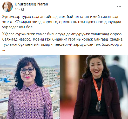 ХУдлаа сүржигнэж хамаг бизнесүүд дампууруулж хаячихаад өөрөө баяжаад наассс. Koвuд гэж биднийг гэрт нь хорьж байгаад хандив, тусламж бүх мөнгийг ямар ч тендергүй зарцуулсан гэж бодохоор л …” хэмээжээ.