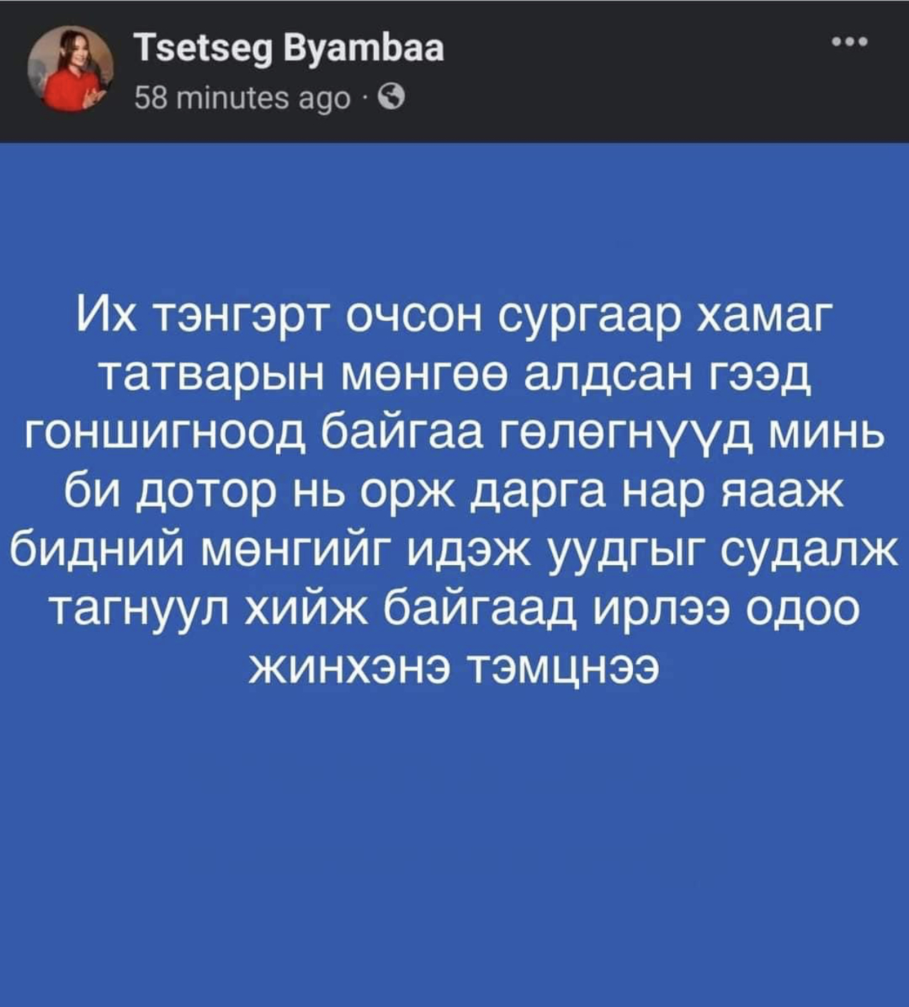 Б.Цэцэг: “Их тэнгэрт очсон сургаар хамаг татварын мөнгөө алдсан гээд гоншигноод байгаа гөлөгнүүд минь би дотор нь орж дарга нар яаж бидний мөнгийг идэж уудгыг судалж тагнуул хийж байгаад ирлээ одоо жинхэнэ тэмцэнээ” гэв.
