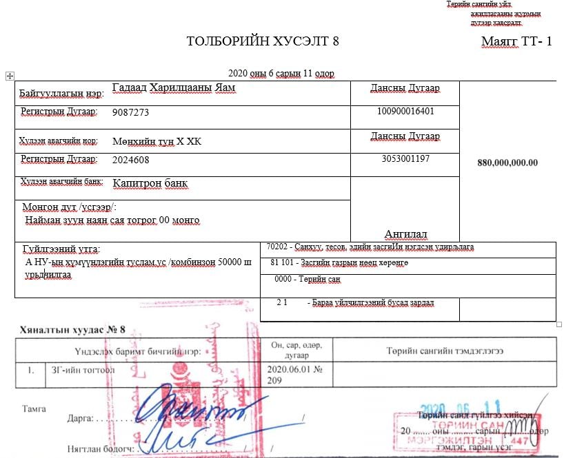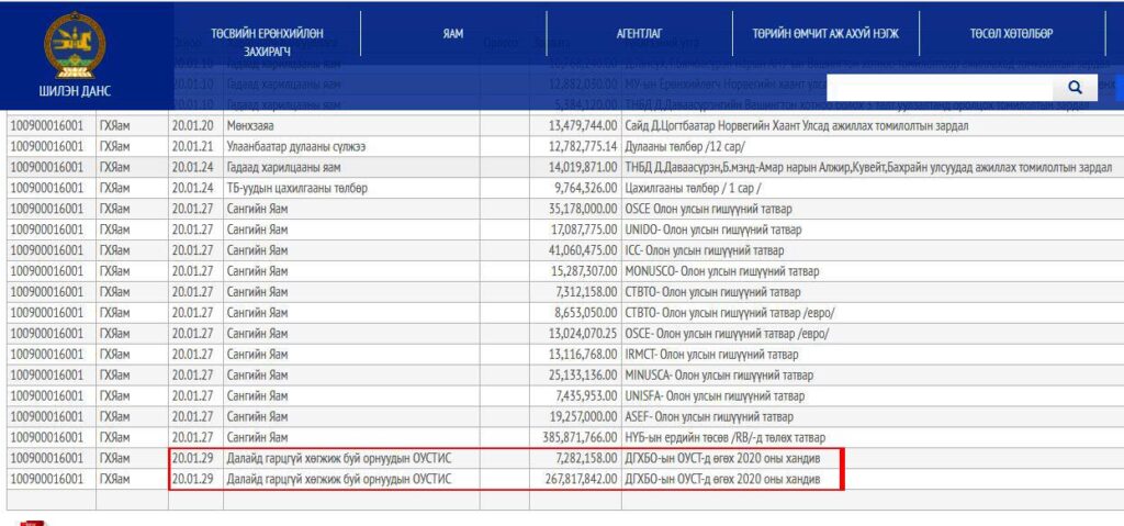 2020 оны нэгдүгээр сард Далайд гарцгүй орнуудын Олон улсын судалгааны төв гэх байгууллагад 275 сая төгрөгийг зүгээр л хандив нэрээр шилжүүлсэн байх юм. Анх Сингапурын ‘Маритайм чейн’ компанитай гэрээ байгуулан ‘Монголын хөлөг онгоцны бүртгэл’ хамтарсан компанийг Монгол улс байгуулснаас хойш өнөөдрийг хүртэл тэдэн төгрөгний ашиг Монголд орж ирлээ гэсэн тоон мэдээлэл алга.