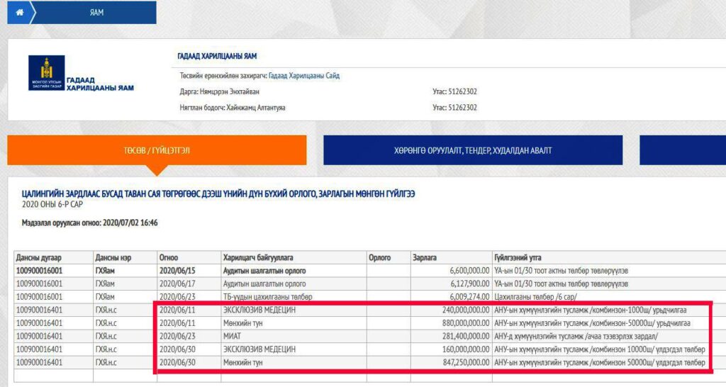 ‘Мөнхийн тун’ компани нийтдээ 1 тэрбум 727 сая 250 мянган төгрөгийн комбинзон ГХЯаманд шахсан бол ‘Эксклюзив медецин’ компани 400 саяын бараа шахжээ. Энэхүү тусламжийн барааг хүлээлгэж өгөхөөр ниссэн МИАТ компани нислэг үйлчилгээний хөлсөнд 281 сая төгрөг гаргуулсан байх юм. Эдгээр баримтууд ГХЯ-ны шилэн данс хөтлөлт дээр он сар, үнийн дүнтэйгээ байгааг та харж болно. Энэ мэт төрийн мөнгийг дур зоргоороо хувийн компани мэт захиран зарцуулж дураараа аашилдаг эрхтэн дархтнуудыг АТГ, зохих хууль хяналтын байгууллагууд шалгах нь зүйтэй болов уу.