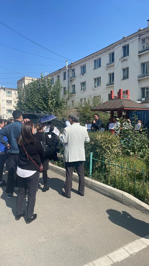 Орос 3-р сургуулийн эцэг эхчүүд Ж.Соронзон захирлыг өмгөөлөн БШУЯ-ны гадаа жагсаж байна