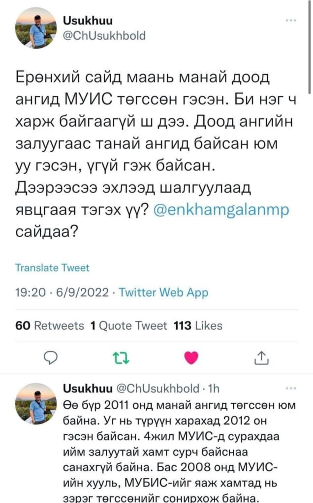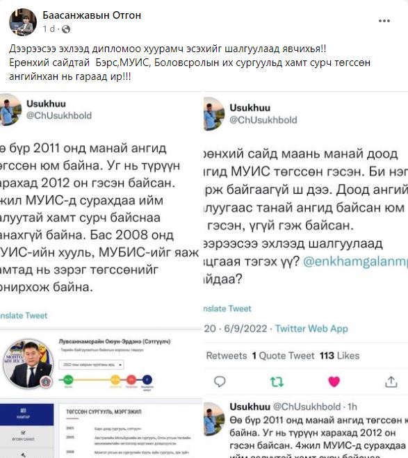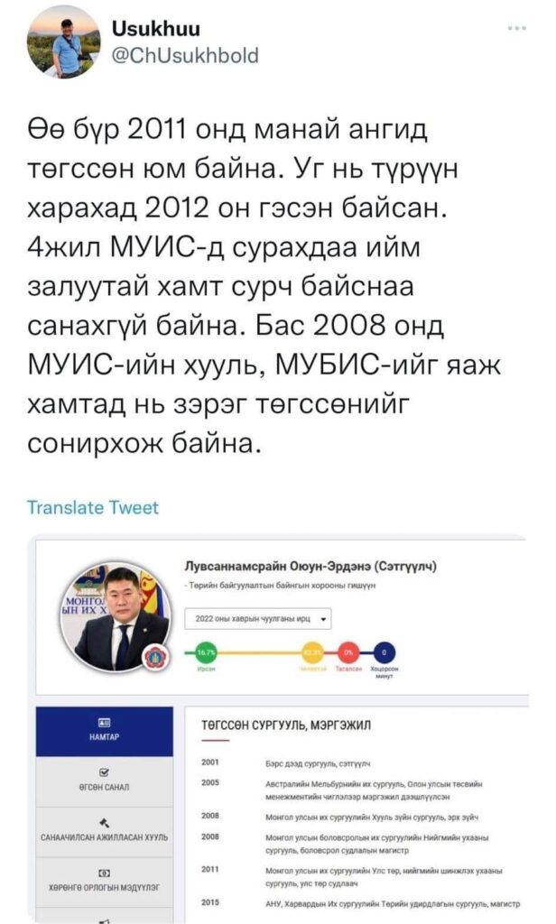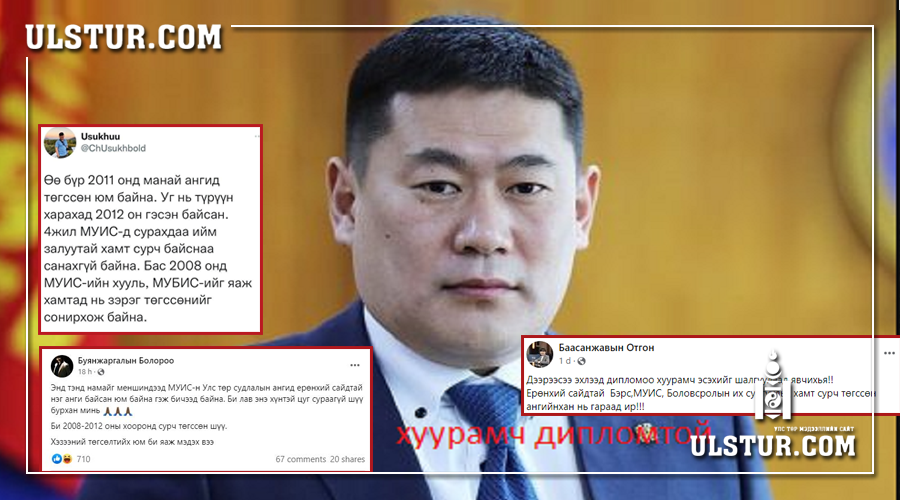 Болосролын сайд Энх-Амгалан хуурамч дипломтой багш нарыг зарлалаа. Үүнийг дагаад маш их будилаан байгаа гэдэг нь олон хүнд ил боллоо. Ерөнхий сайд маань МУИС, МУБИС хоёрт зэрэг сураад зэрэг төгссөн болж таарлаа. Гэтэл эдгээр сургуулиудыг 2011, 2012 онд төгссөн хүмүүс маш их гайхаж ерөнхий сайдыг сургуульдаа сурч байхыг нь нэг ч харж байгаагүй талаар бичиж эхэллээ.