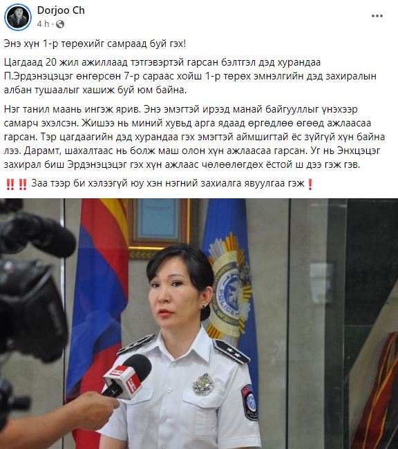 Цагдаад 20 жил ажиллаад тэтгэвэртэй гарсан бэлтгэл дэд хурандаа П.Эрдэнэцэцэг өнгөрсөн 7-р сараас хойш 1-р төрөх эмнэлгийн дэд захиралын албан тушаалыг хашиж буй юм байна.