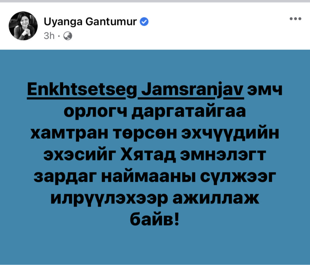 Г.Уянга: “Анагаахын салбарт маш бага цалингаар хүний төлөө сэтгэлээ гарган асар хүнд хөдөлмөр шударгаар хийж байгаа олонх эмч, сувилагч нарыг маш цөөхөн мафижсан хэсэг харлуулж байгаа. Тэр бүлэглэлийг илрүүлж салбарын нэр хүндийг цэвэрлэх болно!