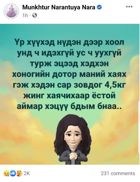 Үр хүүхэд нүдэн дээр хоол унд ч идэхгүй ус ч уухгүй турж эцээд хэдхэн хоногийн дотор маний хаях гэж хэдэн сар зовдог 4,5кг жинг хаячихаар ёстой аймар хэцүү бдым бнаа.. Гэр бүлд үр хүүхдүүд нь эрүүл энхийг хүсье.