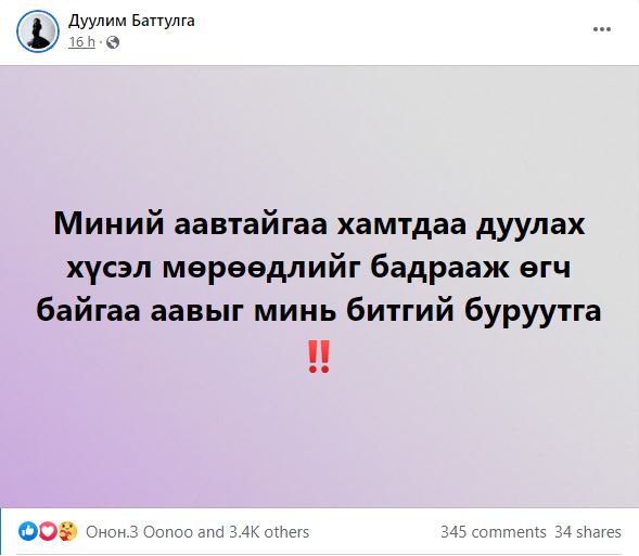 Тэгвэл энэ талаар дуучин Дуулим охин ингэж бичжээ. Ховор хувь тавиланд аавтайгаа дуулаад явж байхдаа маш их баяртай жаргалтай байдаг юмаа би. Аавтайгаа дуулах хувь тавилан тэр болгон хүн бүрт заяахгүй шүүдээ. Адлагдаад доромжлуулаад ч болтугай аавтайгаа дуулна. Бусдын юу гэж хэлэх нь биш аавтайгаа дуулж байгаа минь л надад чухал юм шүү.