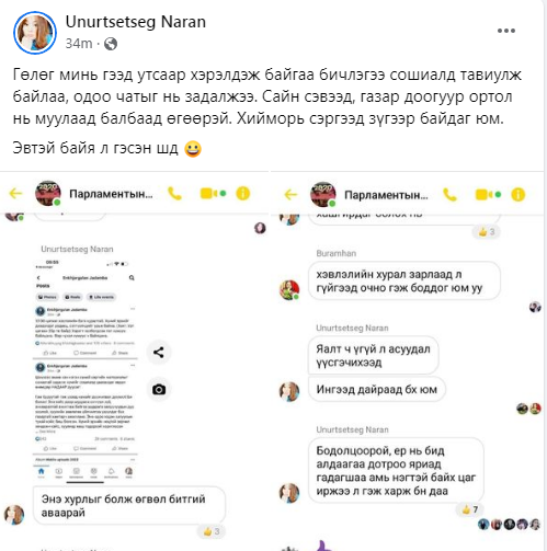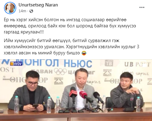 Сэтгүүлч Н.Өнөрцэцэг: “Ер нь хэрэг хийсэн болгон нь ингээд сошиалаар өөрийгөө өмөөрөөд, орилоод байх юм бол шо ронд байгаа бүх хүмүүсээ гаргаад яриулаач!!! Ийм хүмүүсийг битгий өөгшүүл, битгий сурвалжил гэж хэвлэлийнхэнээсээ уриалсан. Хэрэгтнүүдийн хэвлэлийн хурлыг 3 хэвлэл авсан нь миний буруу бишээ.”