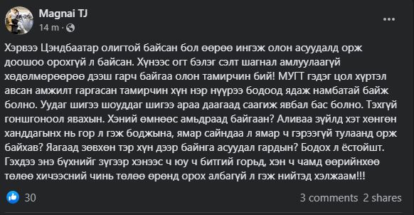 Хэрвээ Цэндбаатар олигтой байсан бол өөрөө ингэж олон асуудалд орж доошоо орохгүй л байсан. Хүнээс огт бэлэг сэлт шагнал амлуулаагүй хөдөлмөрөөрөө дээш гарч байгаа олон тамирчин бий! МУГТ гэдэг цол хүртэл авсан амжилт гаргасан тамирчин хүн нэр нүүрээ бодоод ядаж намбатай байж болно. Уудаг шигээ шоуддаг шигээ араа даагаад саагиж явбал бас болно. Тэхгүй гоншгоноол явахын. Хэний өмнөөс амьдраад байгаан? Аливаа зүйлд хэт хөнгөн ханддагынх нь гор л гэж боджына, ямар сайндаа л ямар ч гэрээгүй тулаанд орж байхав? Яагаад зөвхөн тэр хүн дээр байнга асуудал гардын? Бодох л ёстойшт. Гэхдээ энэ бүхнийг зүгээр хэнээс ч юу ч битгий горьд, хэн ч чамд өөрийнхөө төлөө хичээсний чинь төлөө өрөнд орох албагүй л гэж нийтэд хэлжаам!!! гэжээ.