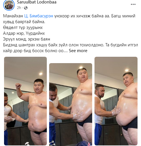 Өнөөдөр Бямбаа маань над дээр ирлээ. 34 нас гэдэг ид залуу нас 220 кг дэндүү их жин. Юу туулж өнөөдөр хүрсэн нь ойлгомжтой. Надаас туслаж гуйж ирсэн би, бид багаараа чадахаараа хичээнэ. Тэр Багшаа би нүцгэн зураг даруулаад дараа нь харьцуулсан зураг даруулж өөр шигээ олон залууст урам өгмөөр байна гэв. Багш нь хичээнэ. Хойш нь суухгүй маргаашаас бэлтгэлдээ орно. Сайныг ерөөж, амжилт хүсээрэй…