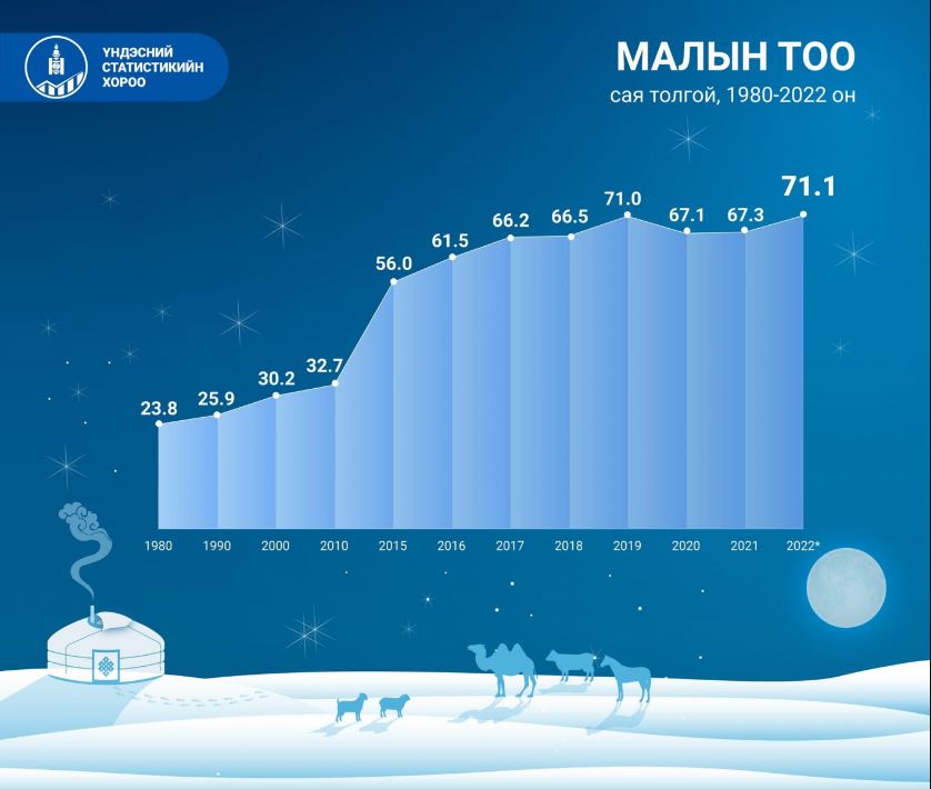 Мал, тэжээвэр амьтдын тооллогын сүүлийн 10 жилийн үзүүлэлтийг харвал 2022 онд улсын хэмжээнд 71.1 сая толгой мал тоологдож, түүхэндээ хамгийн өндөр үзүүлэлт боллоо.