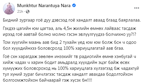 Гоё схн харагдаж зөөлөн инээхийг тв радиогийн өмнө хэнбугай ч хийж чадах ч харин бодит амьдралд хүүхдийн эцэг байж өсөх хүмүүжих боловсроход нь 100% хариуцлага хүлээгээд бж чадахгүй тул хүний зураг бичлэгээс тасдаж хандалт авахдаа бодолтойхон болгоомжтойхон байчаарай гэж хүсэх байна.” хэмээн бичжээ.
