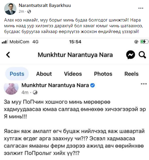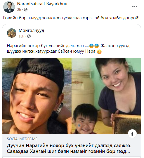 Дуучин Нара говийн бортойгоо түр тар хийж түүнд ширүүхэн үгнүүд цахим хаягаараа дайгаад буй. Тэгвэл уг асуудалд УИХ-ын гишүүн Ч.Ундрамын нөхөр Б.Наранцацралт “зовлон нэгтээ” өрөвдөв үү гэлтэй ийнхүү бичжээ. Тэрбээр: “Говийн бор залууд зөвлөгөө туслалцаа хэрэгтэй бол холбогдоорой!”