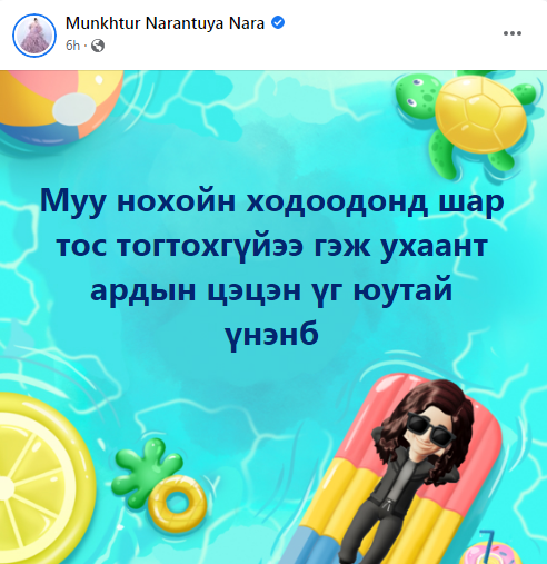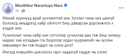 Сүүлийн хоёр хоног л Нарагийн гэр бүлийн талаар улсаараа ярилцлаа. Тэрээр говийн бор надгүйгээр амьдаар үзэхгүй юм гэж хэлээд хөдөө орхиод явчихсан гэх утгатай зүйлийг хэлсэн. Харин тэр салах болтолоо уурлаж тмуудсан тэр өдөр юу болсон талаараа лайв хийж хэллээ. Түүний нөхөр ангийнхаа уулзалтад явж сагс тоглохыг хүсжээ.