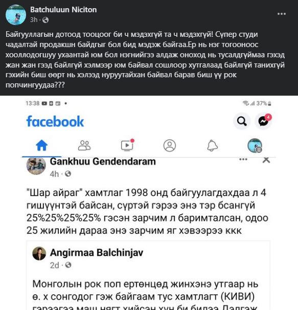 Байгууллагын дотоод тооцоог би ч мэдэхгүй та ч мэдэхгүй! Сүпер студи чадалтай продакшн байдгыг бол бид мэдэж байгаа. Ер нь нэг тогооноос хооллодогшуу ухаантай юм бол нэгнийгээ алдаж оноход нь тусалдгүймаа гэхэд жан жан гээд байлгүй хэлмээр юм байвал сошлоор хутгалаад байлгүй танихгүй гэхийн биш өөрт нь хэлээд нуруутайхан байвал барав биш үү рок попчингуудаа???