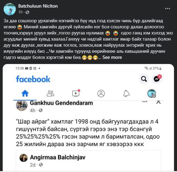 Никитон хамтлагын ахлагч дуучин Баачка буюу Батчулуун Болдыг өмөөрч өөрийн сошиал хуудаснаа мэдэгдэл хийгээд байсан билээ. Тэгвэл Шар айраг хамтлагын ахлагч, аялагч Г.Ганхүү хариуд нь ингэж бичжээ.