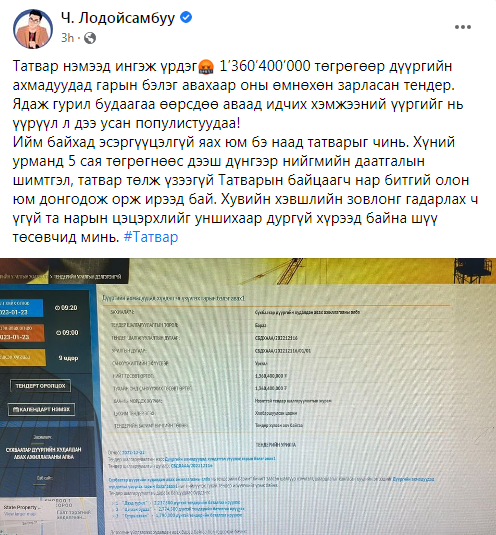 Тэгвэл уг асуудалд Сэтгүүлч Лодойсамбуу ийнхүү ярьлаа. Тэрбээр: Татвар нэмээд ингэж үрдэг… 1’360’400’000 төгрөгөөр дүүргийн ахмадуудад гарын бэлэг авахаар оны өмнөхөн зарласан тендер. Ядаж гурил будаагаа өөрсдөө аваад идчих хэмжээний үүргийг нь үүрүүл л дээ усан популистуудаа!