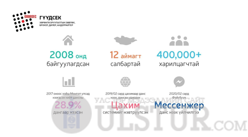 Дансаа мессенжерээр нээлгэхдээ мэдээллүүдээ КИРИЛЛ үсгээр оруулах ёстойг анхаараарай. Та Гүүдсек Үнэт цаасны компанийн харилцагч болсноор үнэт цаасны дансаа онлайнаар удирдах, ногдол ашгаа банкны дансандаа авах, хувьцаа худалдах, худалдан авах захиалгаа өгөх зэрэг үйлчилгээг хүссэн үедээ, хаанаас ч харилцагчийн цахим системд нэвтрэн онлайнаар авах боломжтой.